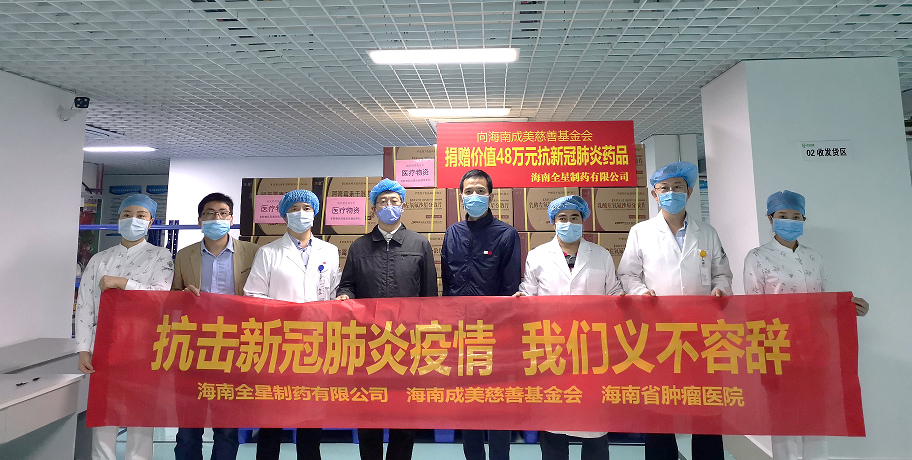 在全省上下疫情防控關(guān)鍵時(shí)期,海南全星制藥有限公司始終不忘履行社會(huì)責(zé)任,繼2月5日向??谑屑t十字會(huì)捐贈(zèng)107萬元的抗疫藥品后,全星再行動(dòng),2月7日,向海南成美慈善基金會(huì)捐贈(zèng)價(jià)值48萬元的抗疫藥品,用于支持海南省腫瘤??漆t(yī)療聯(lián)合體下轄110多家醫(yī)療機(jī)構(gòu)開展一線疫情防控工作,助力我省早日打贏疫情防控攻堅(jiān)戰(zhàn)。